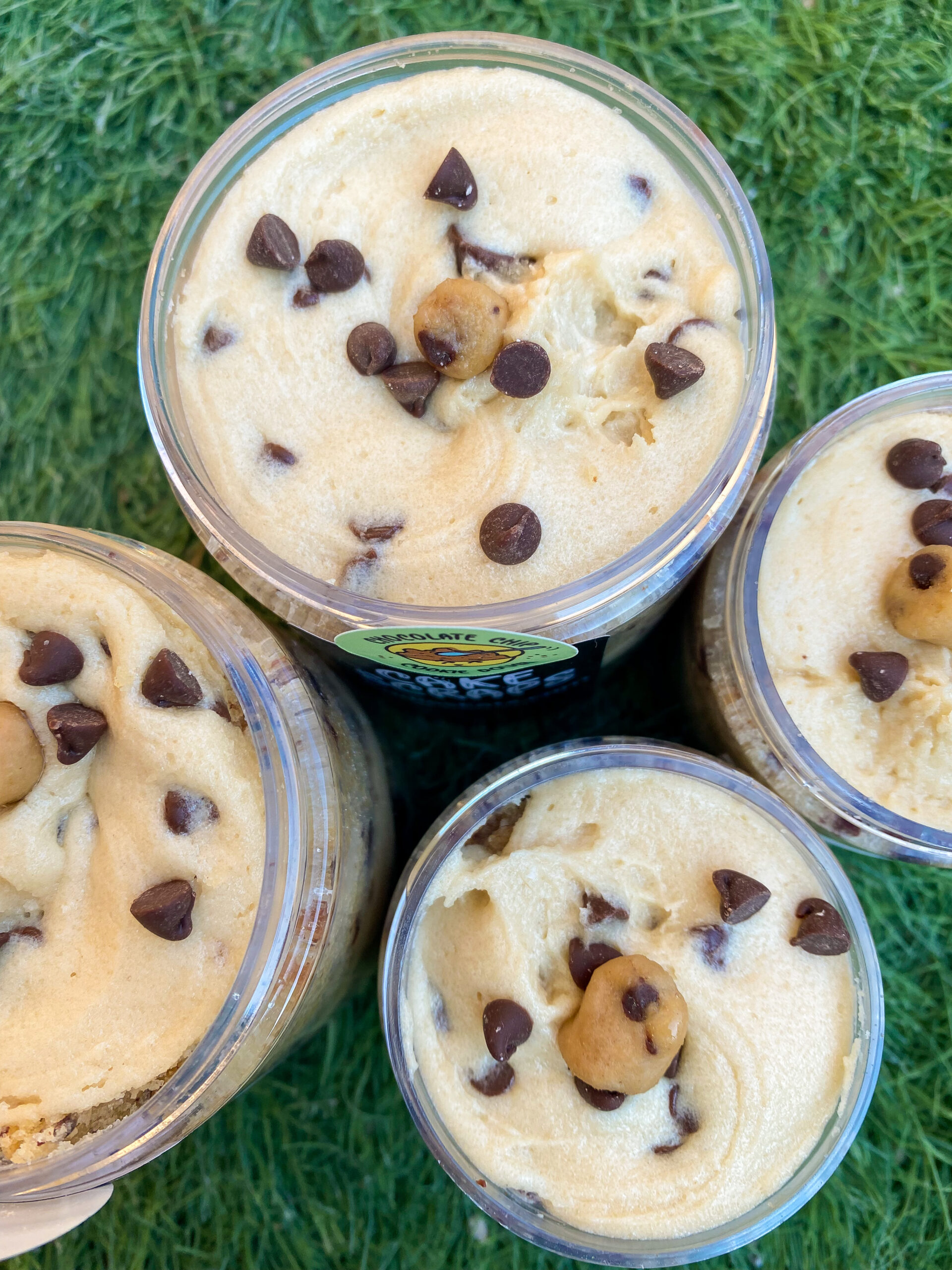 Chocolate chip vanilla cake layered with cookie dough frosting, pieces of edible cookie dough and chocolate crunchies.